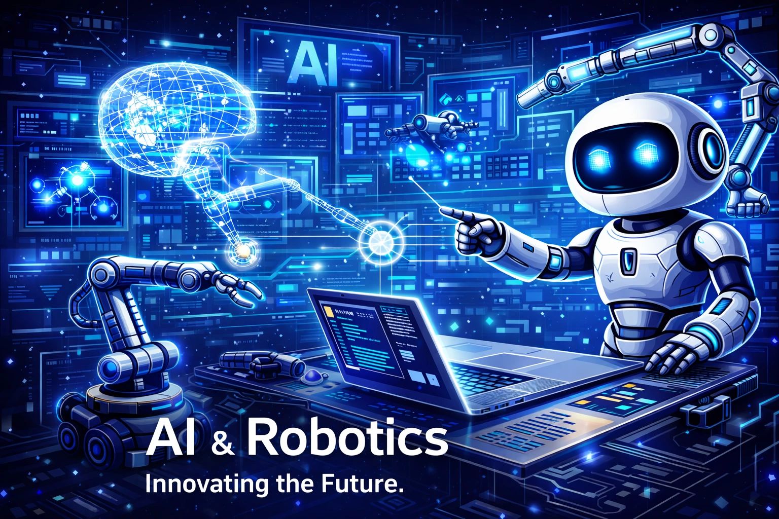 Artificial Intelligence and Robotics combine intelligent software with physical machines, enabling systems to sense their environment, make decisions, and act autonomously through sensors, data, and control systems.